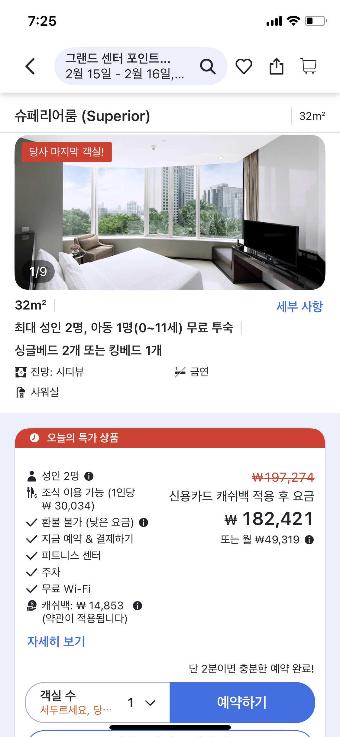 2. 슈페리어룸 (싱글베드 2개 또는 킹베드 1개) 약 18만원