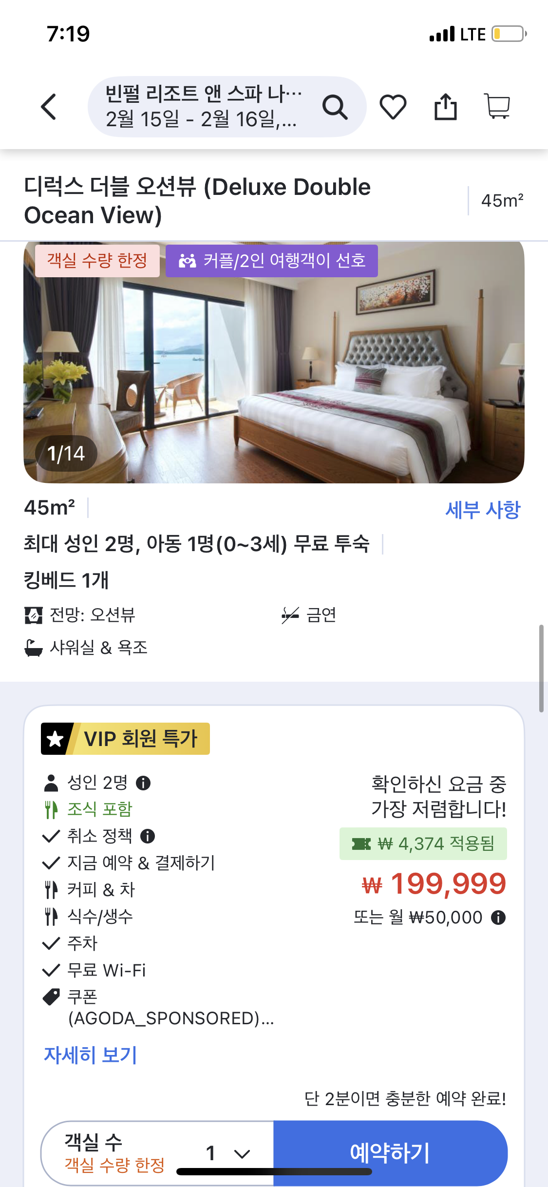 2. 디럭스 더블 오션뷰 (킹베드 1개) 약 19만원