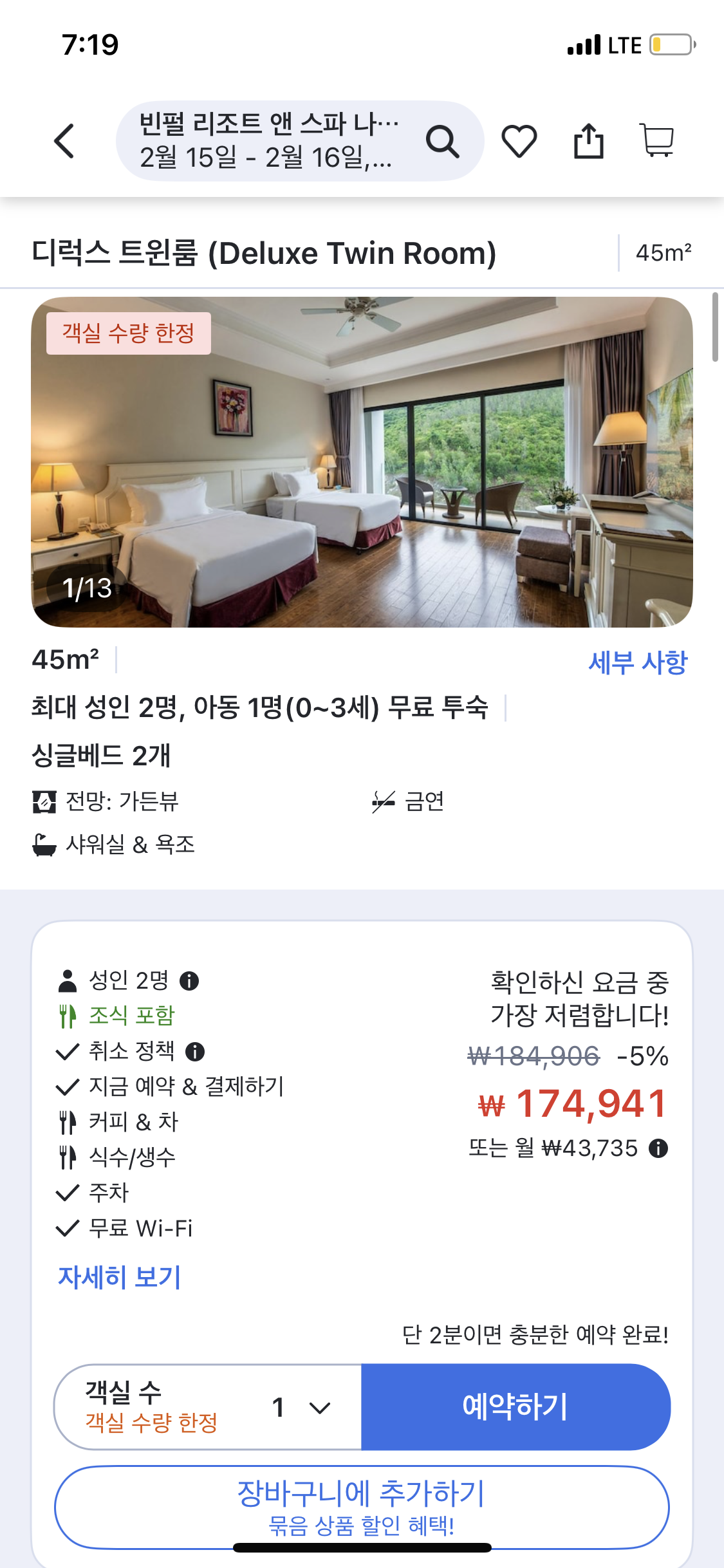 : 최대 성인2명, 아동 1명 (0~3세) 무료 투숙, 전망: 가든뷰