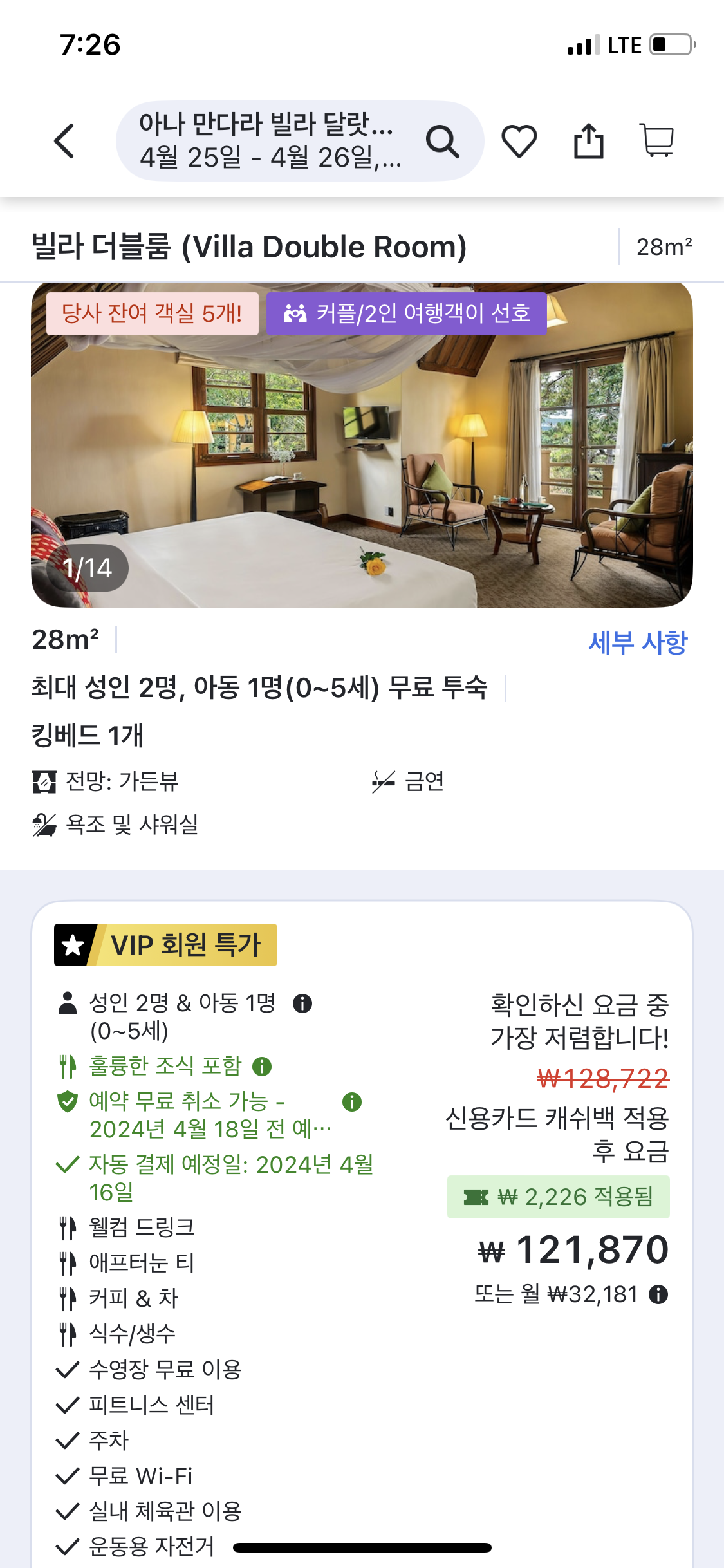 : 최대 성인2명, 아동 1명 (0~5세) 무료 투숙, 전망: 가든뷰