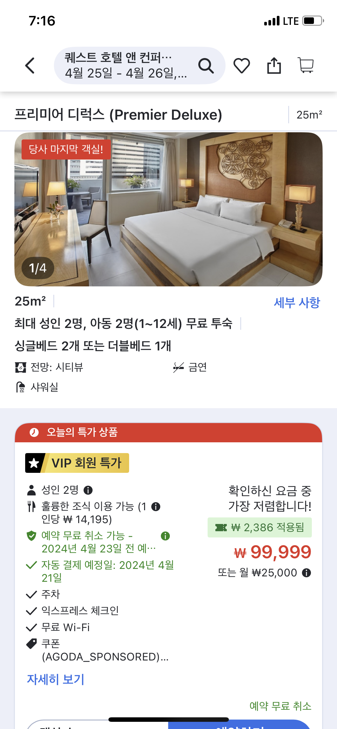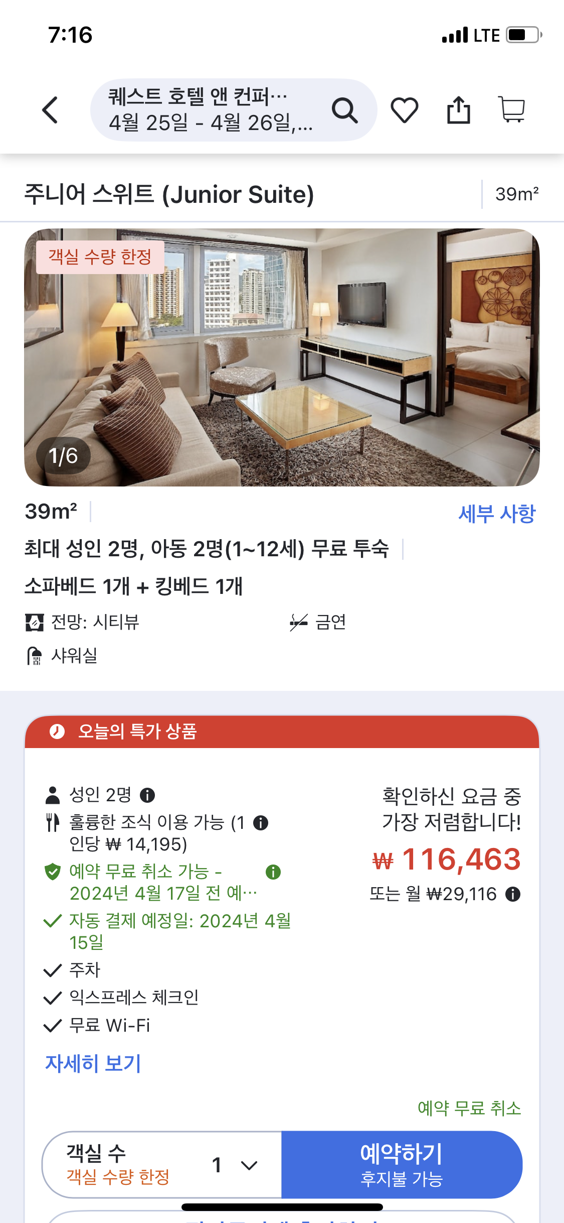 : 최대 성인2명, 아동 1명(1~12세) 무료 투숙, 전망: 시티뷰