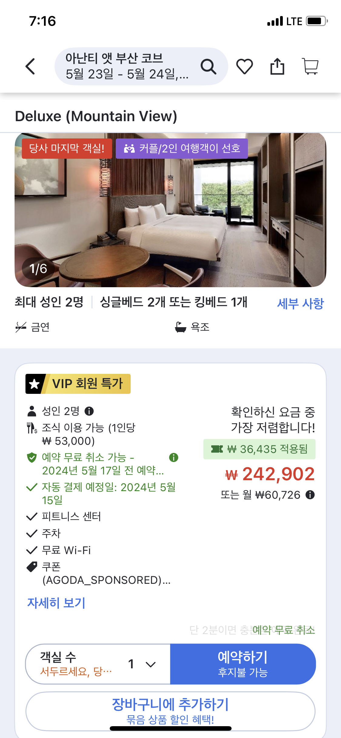 1. 디럭스 (마운틴 뷰, 싱글베드 2개 또는 킹베드 1개) 약 24만원